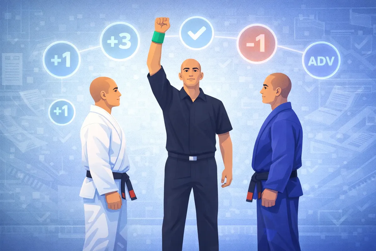 Complete breakdown of the IBJJF points system including point values, advantages, penalties, referee signals, and strategic tips for scoring in BJJ competition.